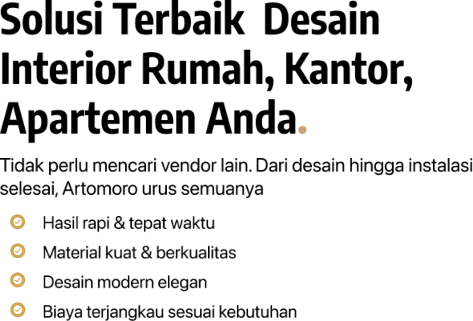 Desain premium modern, pengerjaan rapi, dan kualitasnya benar-benar sesuai harapan.—itulah alasan klien memilih Artomoro untuk rumah, apartemen, villa dan kantor mereka.